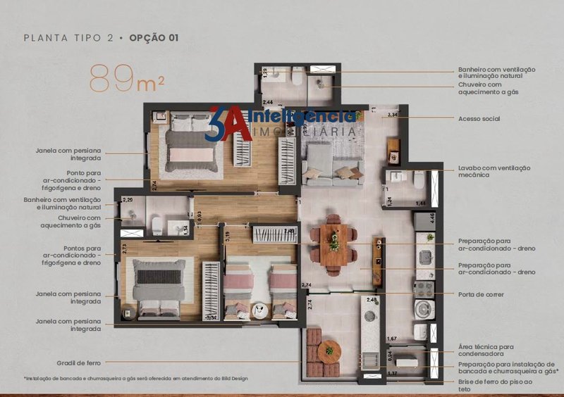 89m² - 3 dormitórios, sendo 1 suíte, 2 vagas