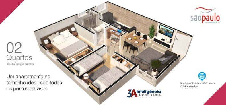 Excelente apartamento no Condomínio Residencial São Paulo na zona norte de Sorocaba. São 4 andares por torre e 4 apartamentos por andar. Preparação de ponto de ar condicionado no dormitório de casal. Previsão de entrega fevereiro/2024.