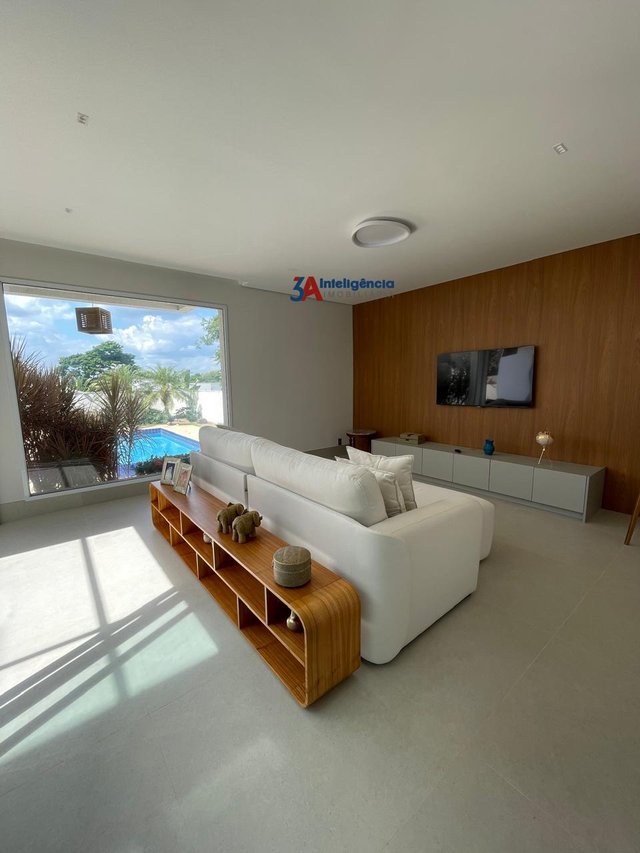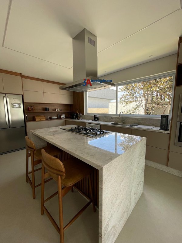 No térreo, temos uma sala de TV, sala de leitura, sala jantar, cozinha toda planejada com ilha, cooktop, coifa, despensa e sala de apoio, 1 suíte, lavanderia, lavabo e dependência de emprega (1 suíte). Na área externa temos lounge com lareira e teto retrátil e a área gourmet que é um destaque à parte, com churrasqueira, forno de pizza, mesa com 8 lugares, fogão a gás, lavabo, geladeira e uma piscina com prainha.
