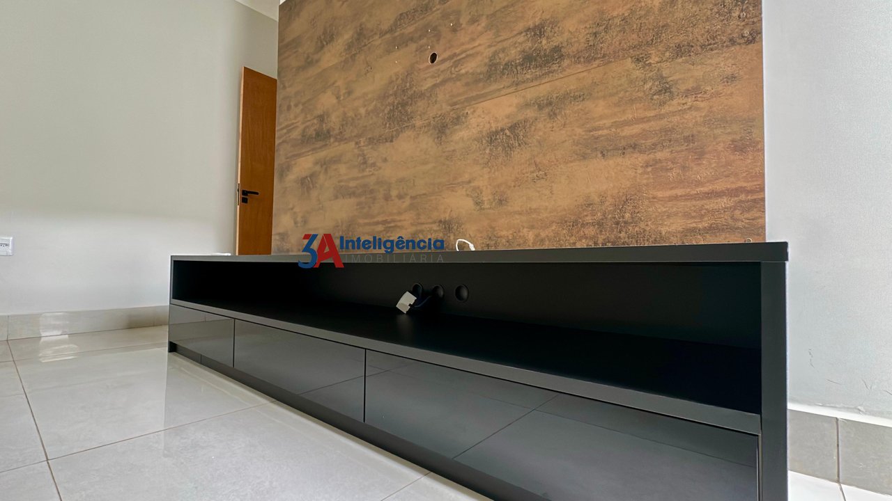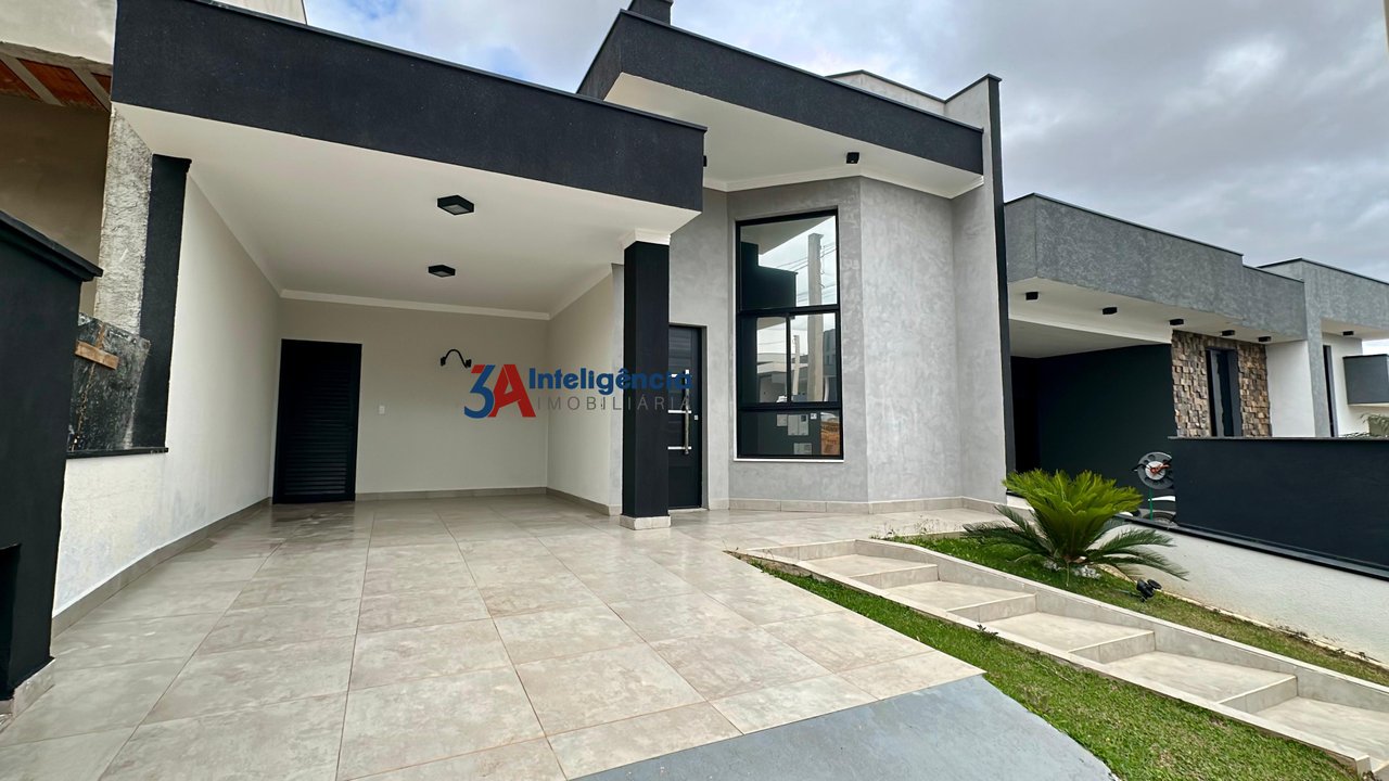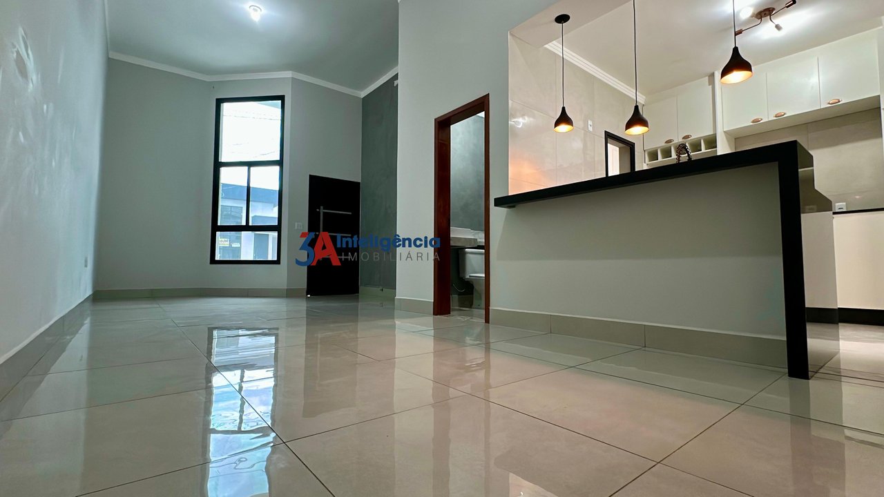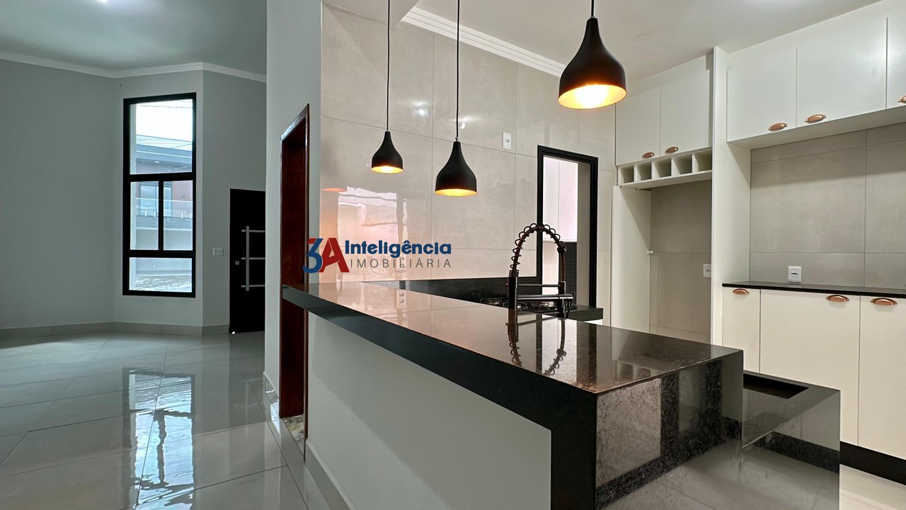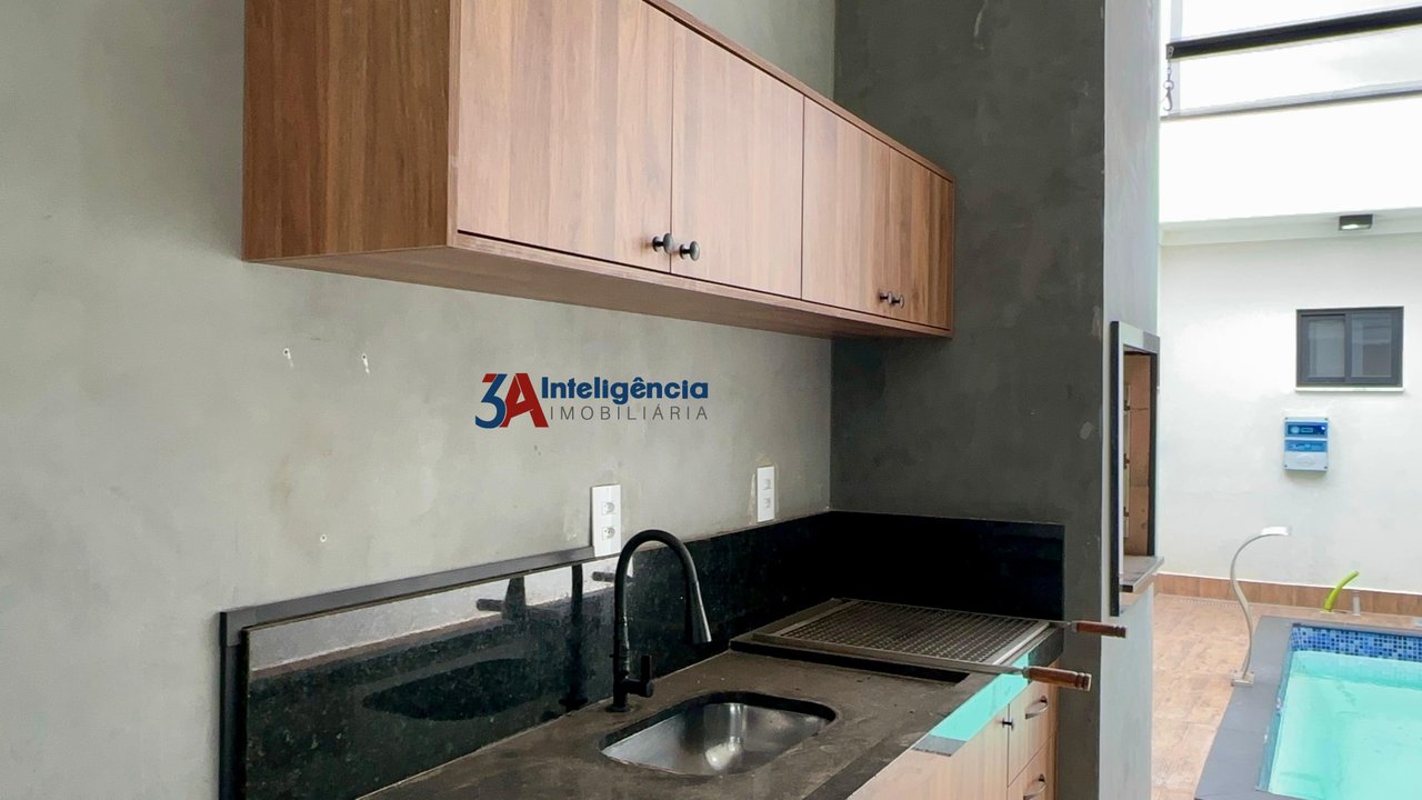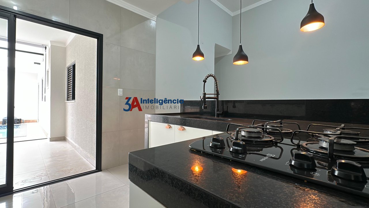 Linda casa térrea no condomínio Villagio Wanel, com 3 dormitórios sendo 1 suíte, sala com pé direito alto e rack para TV, cozinha com armários, cooktop e luminárias, banheiro social com box em vidro temperado e pia com cuba sobreposta, lavanderia com tanque e armários, área gourmet com churrasqueira e armários, piscina com cascata, lavabo e 2 vagas de garagem, sendo 1 coberta.